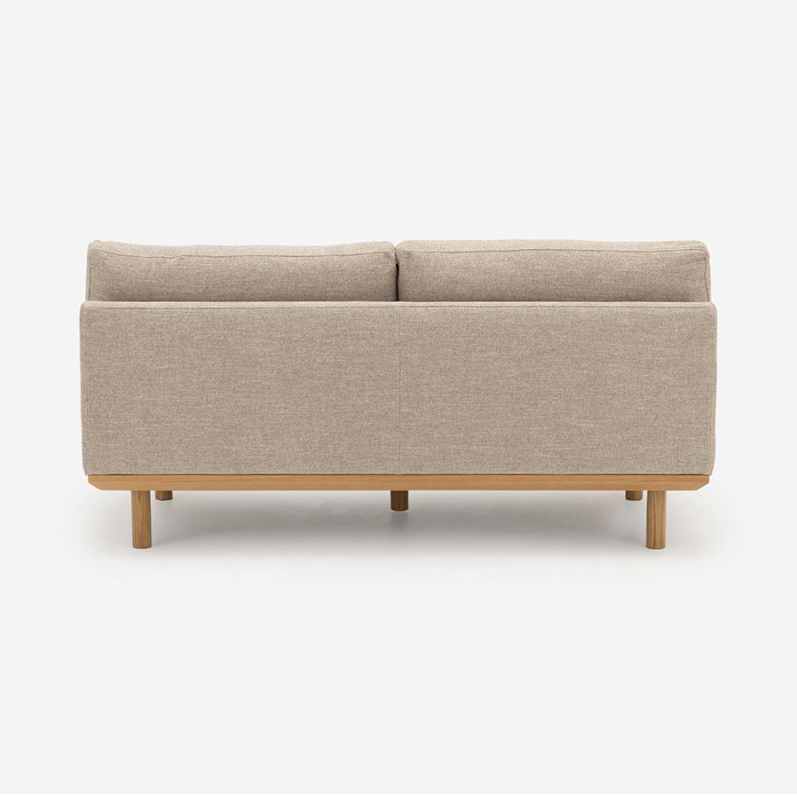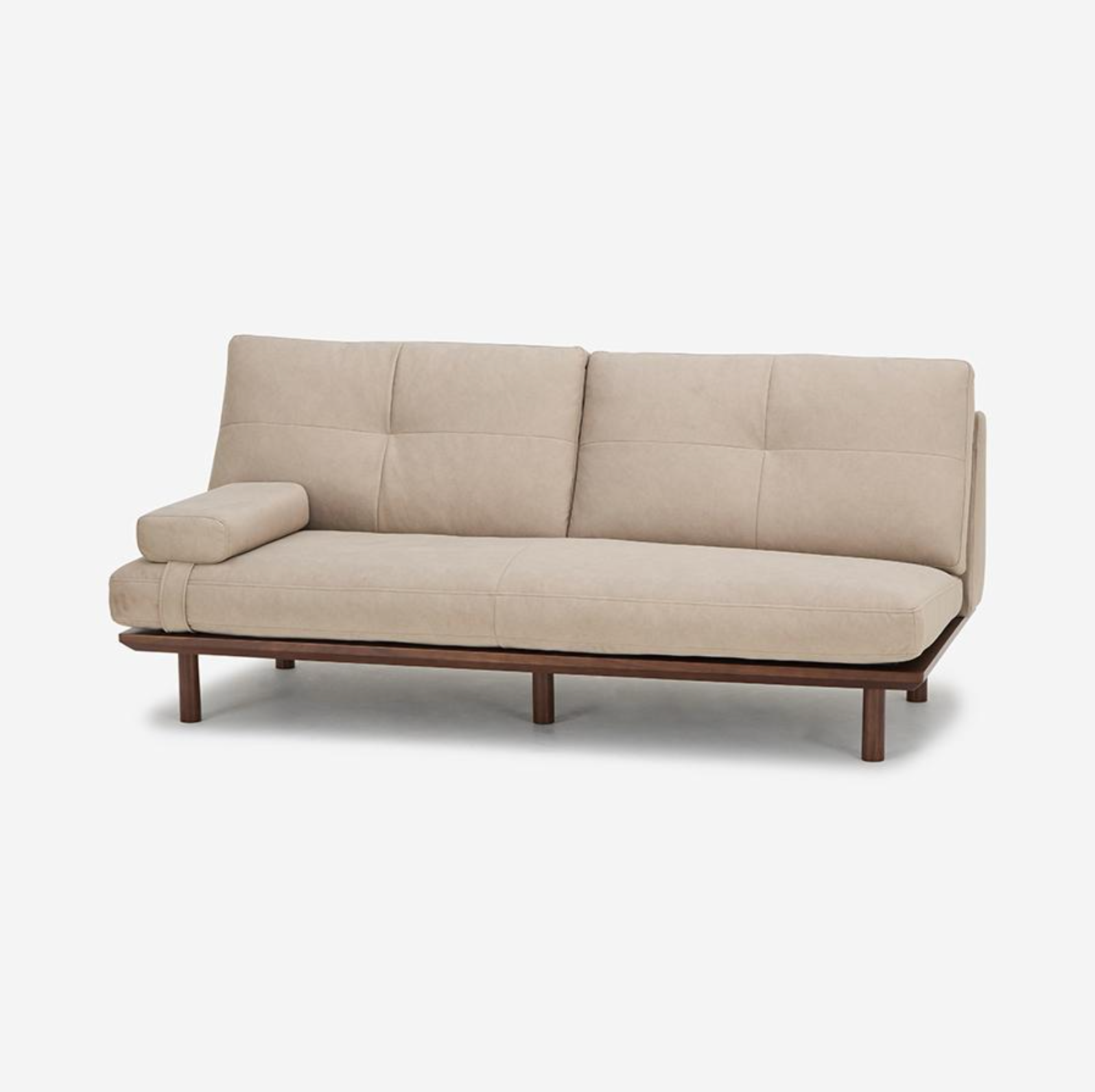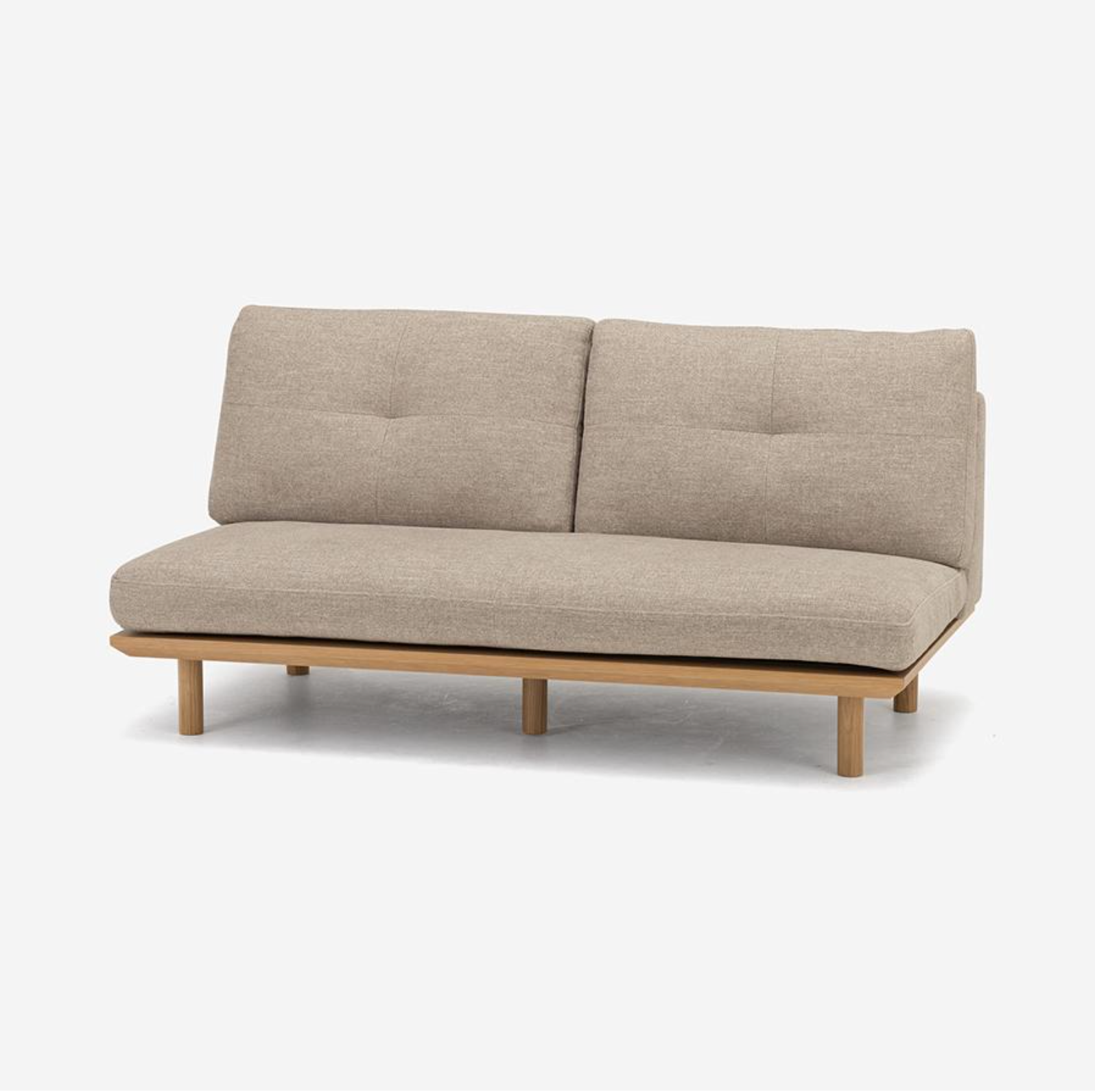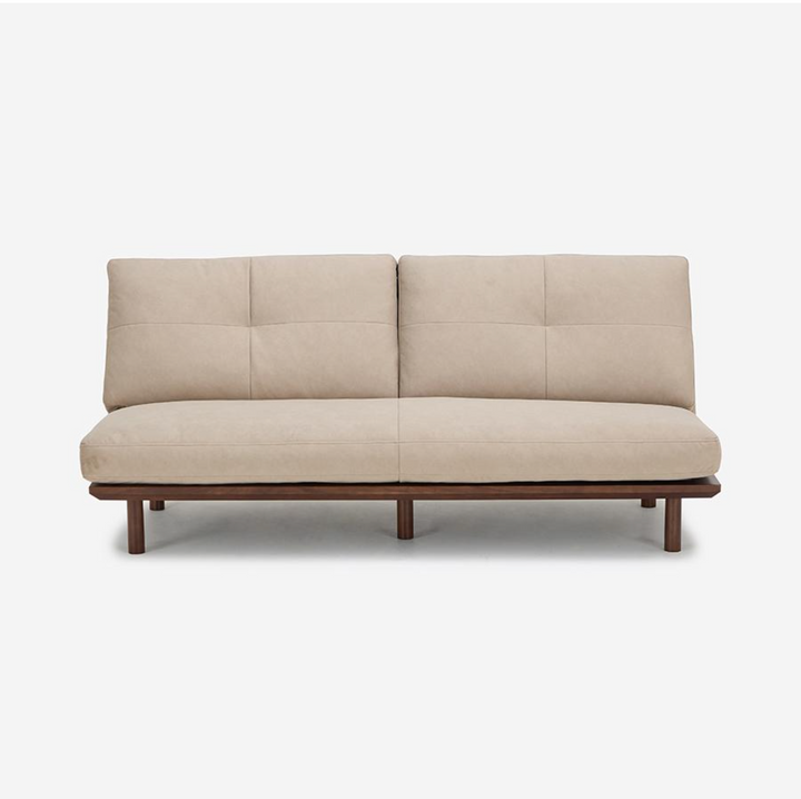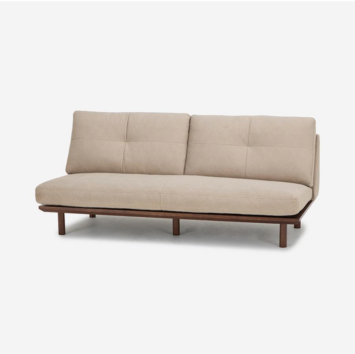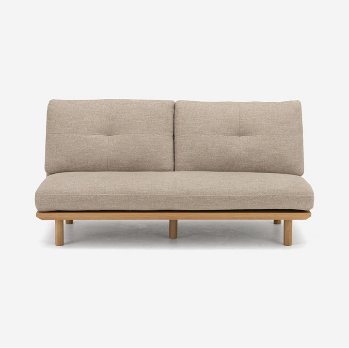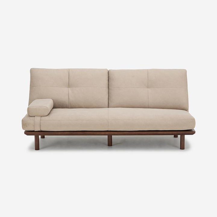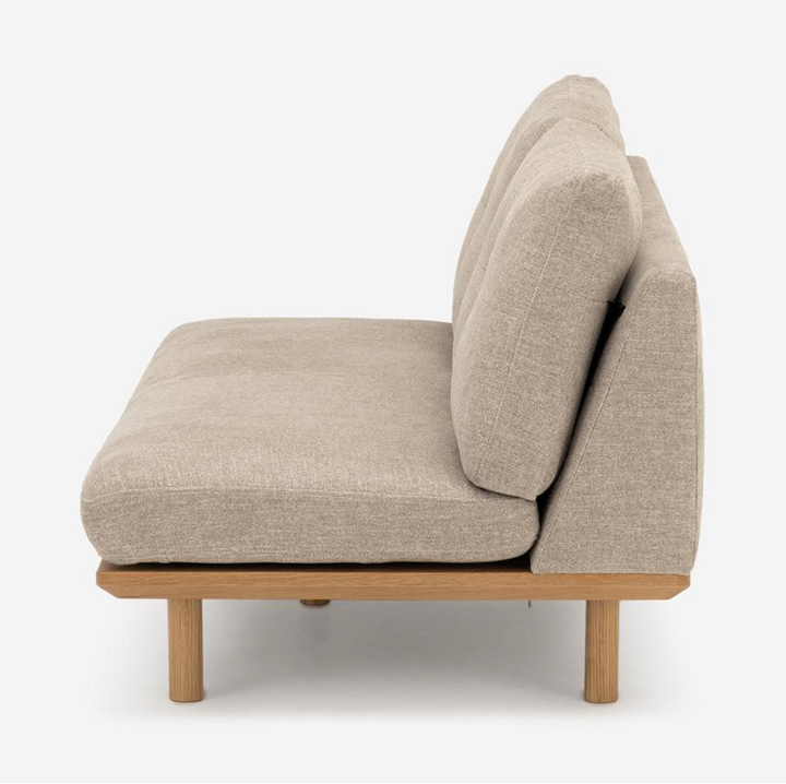 FLAD 沙發採用實木框架搭配背靠與座墊,展現無扶手的極簡設計。由於沒有固定扶手,座面空間更加寬敞充裕。