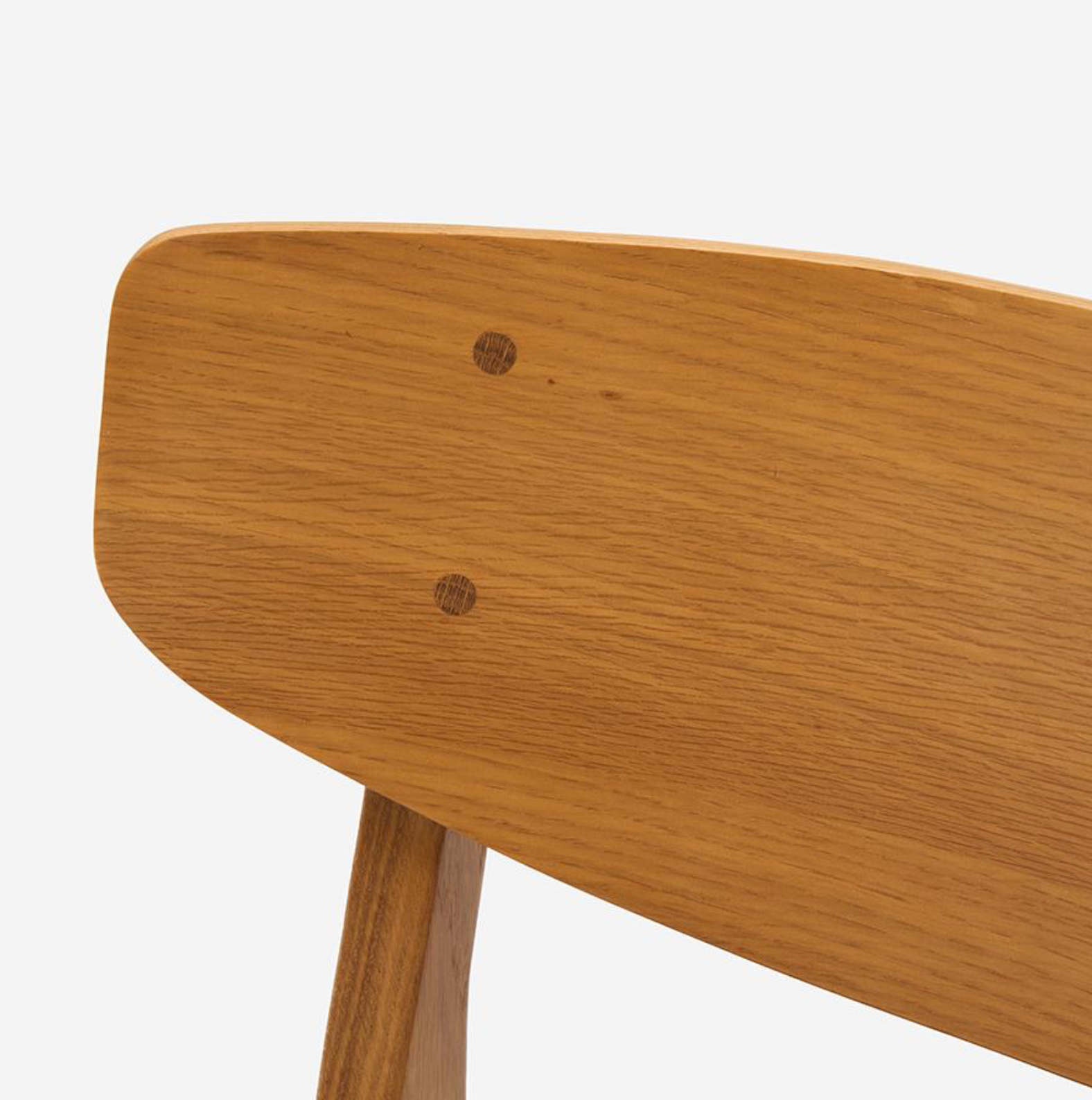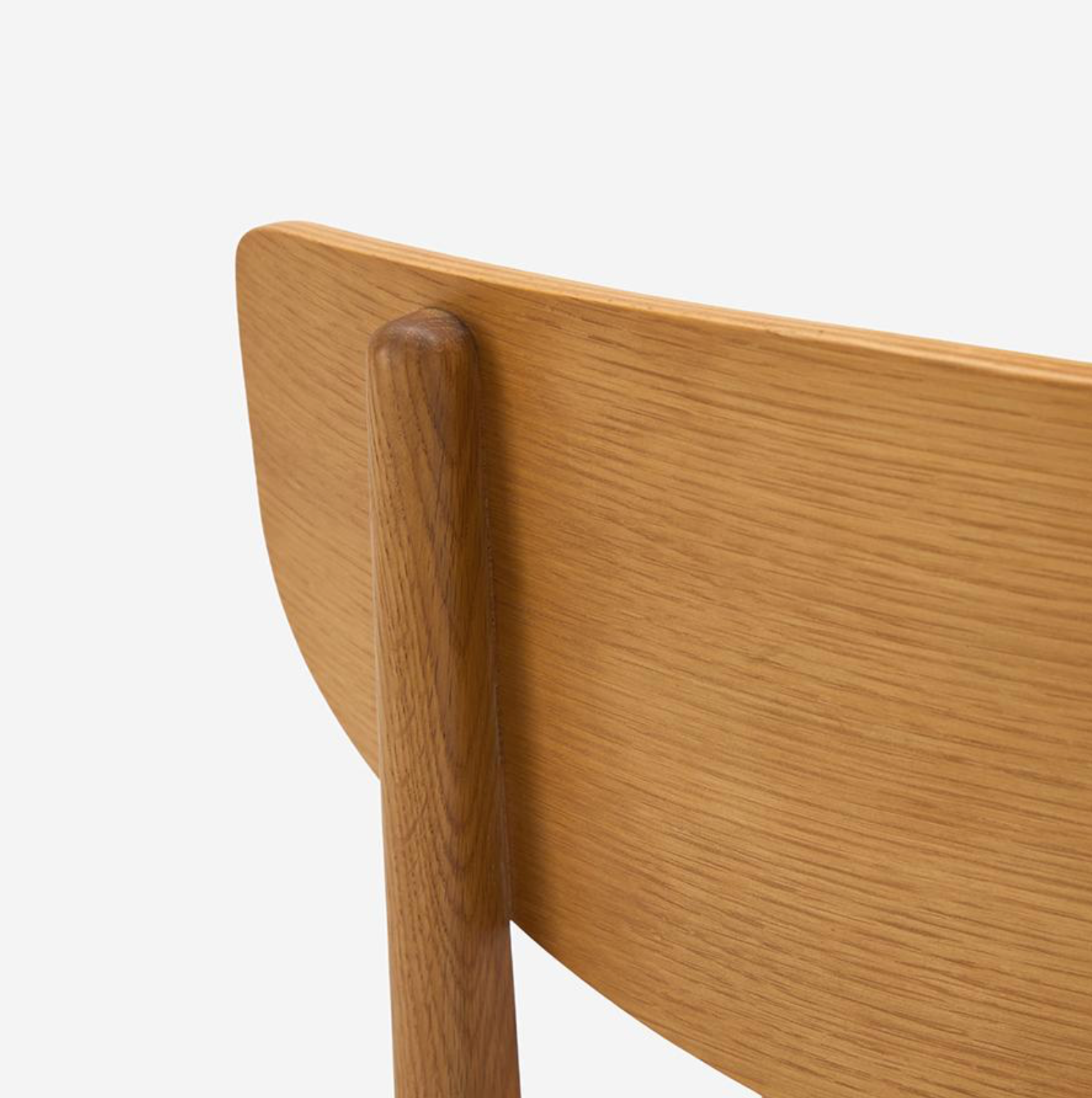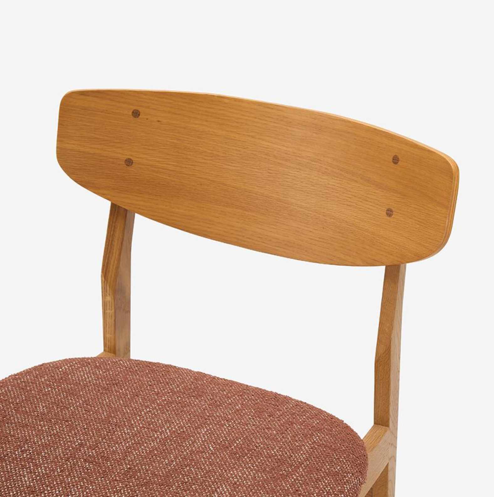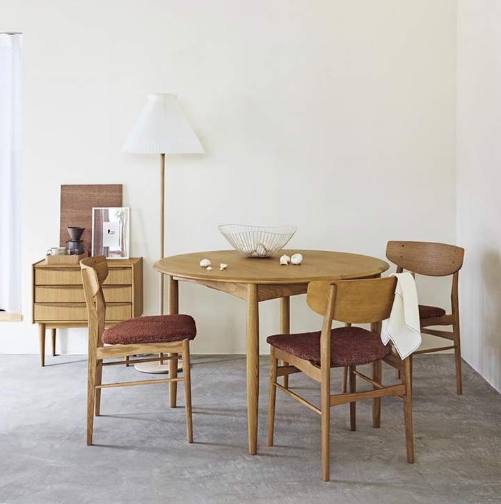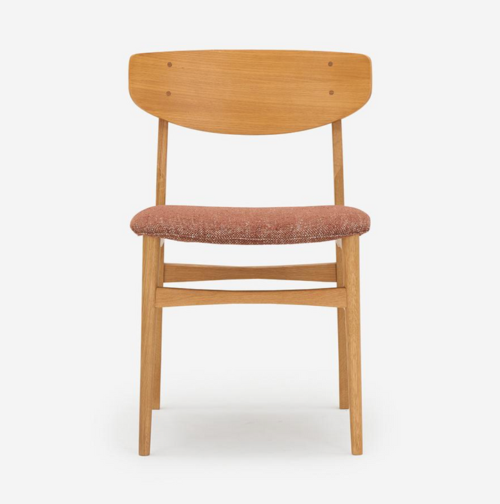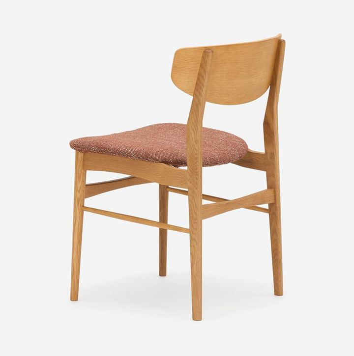 此款餐椅以纖細的零件構成輕盈、柔合的輪廓。設計細節體現北歐有機設計對人體工學的考量:座墊前緣的弧度減少了對大腿的壓迫感;寬大的椅背具備包覆的支撐。此外,曲線椅背與椅腳接合處的圓形木栓細節,穩固結構,也提升精緻度,呈現出手工家具的溫度。