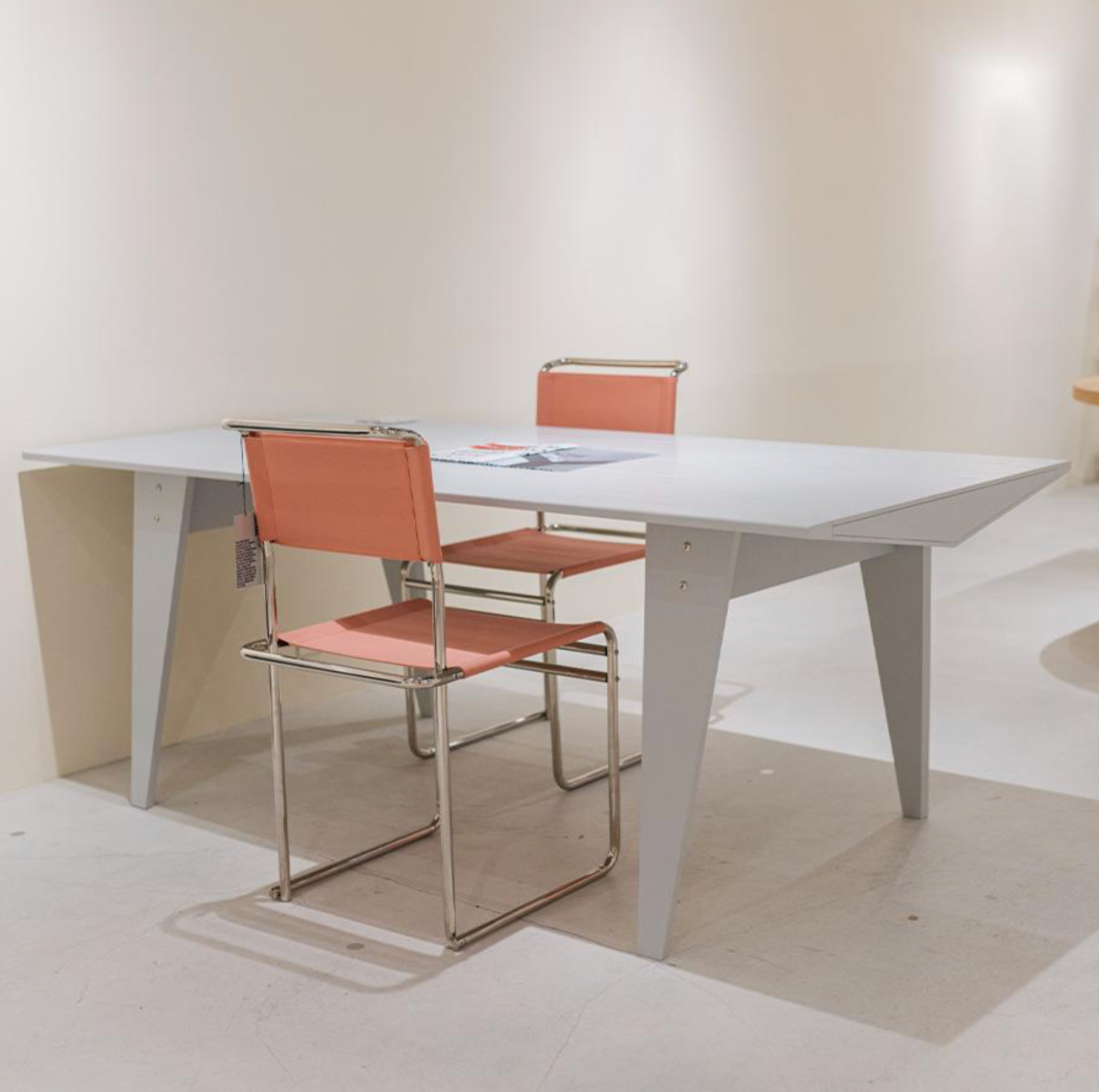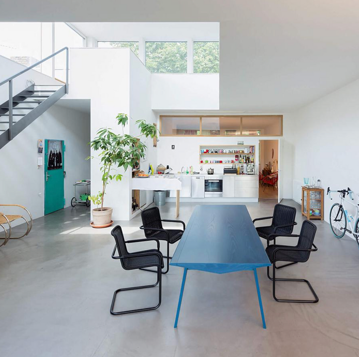 M36 系列由設計師安德烈·魏瑟特(Andree Weissert)操刀,其靈感源於散步時偶然瞥見位於柏林克羅伊茨貝格(Kreuzberg)的高架鐵路橋樑結構。這款餐桌將工業建築語彙轉化為家具設計,俐落的支架線條與鮮明的色彩搭配,是空間中極具張力與功能的現代藝術裝置。