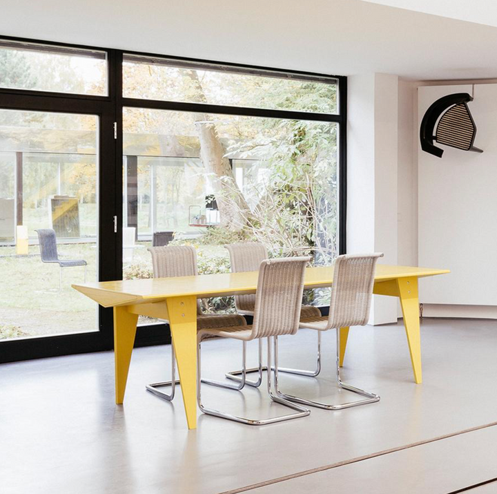 M36 系列由設計師安德烈·魏瑟特(Andree Weissert)操刀,其靈感源於散步時偶然瞥見位於柏林克羅伊茨貝格(Kreuzberg)的高架鐵路橋樑結構。這款餐桌將工業建築語彙轉化為家具設計,俐落的支架線條與鮮明的色彩搭配,是空間中極具張力與功能的現代藝術裝置。